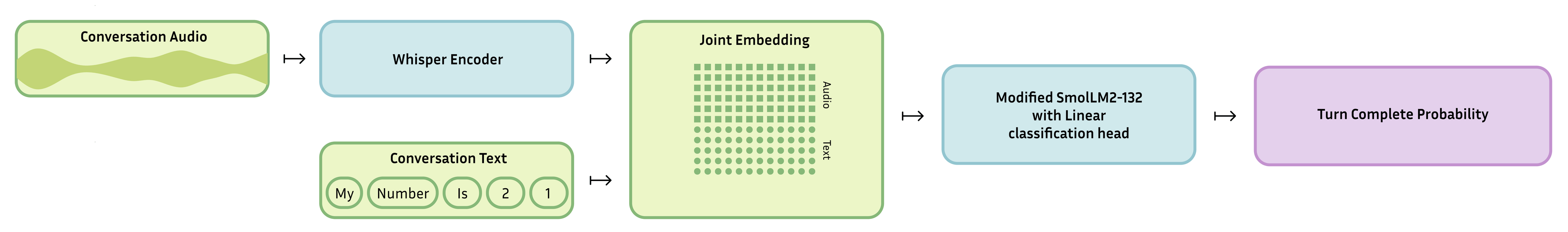The audio embeddings are prepended to the text sequence, allowing the language model to attend jointly across both modalities. This design enables the model to reason about questions like "Given the acoustic properties of this utterance and the conversational context, has the speaker finished their turn?"